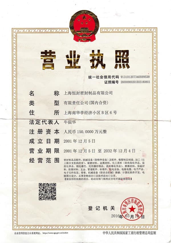 荣誉资质 上海恒封密封制品有限公司营业执照