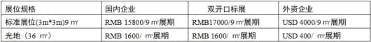 ◆标准展位费用:包括展出场地、2.5m高壁板、楣牌制作、9平方米地毯、洽谈桌一张、椅子二把、10A/220V 单相插座一个,射灯二支。