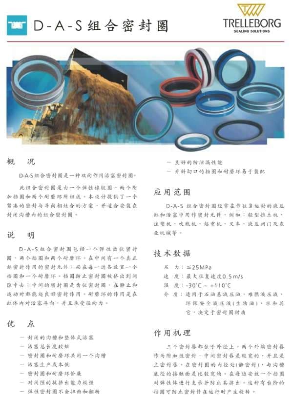 D-A-S组合密封常被用作重复往返运动的液压缸和活塞的密封元件。比如:轻型推土机、注塑机、吹塑机、起重机、叉车、液压闸门和农业机械。