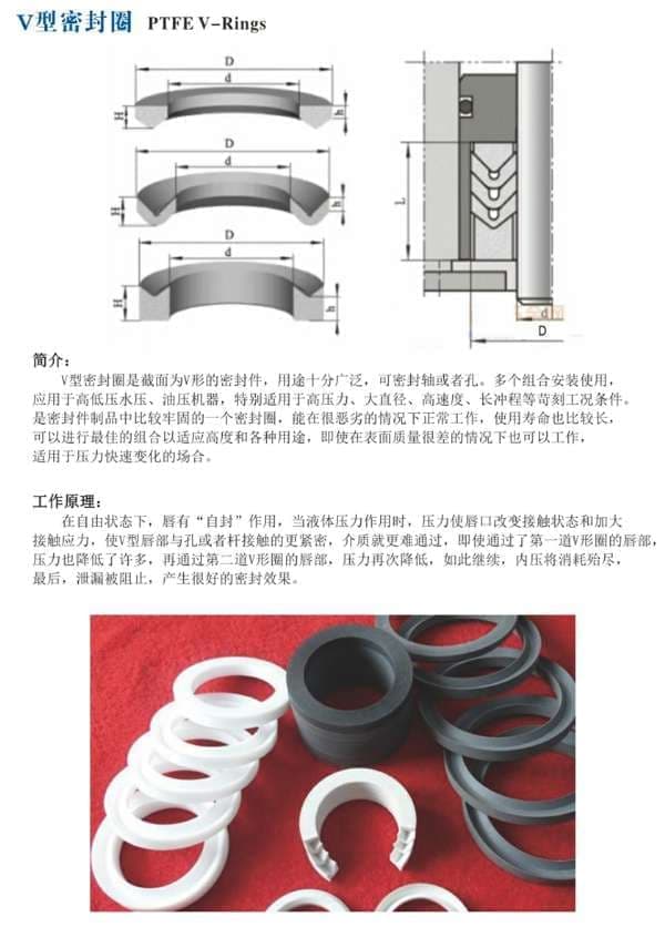 在自由状态下,唇能够自动密封,当液体压力作用时,压力会改变唇部的接触状态并增加接触应力。使V形唇部更靠近孔或杆,介质更难以通过,在通过**个V形圈的唇部时其压力就会大大降低,再次通过第二道V形圈的唇部时,压力也随之降低,如果这样继续下去,内部的压力就会耗尽,*后,泄漏将被停止,从而产生良好的密封效果。
