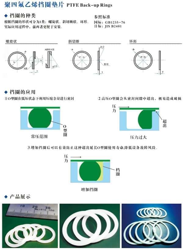 聚四氟乙烯挡圈:优异的耐磨性和自润滑性,良好的延伸率和聚四氟乙烯的抗压强度。广泛用于各种需要自润滑,耐磨,耐腐蚀,耐油和水润滑的条件。