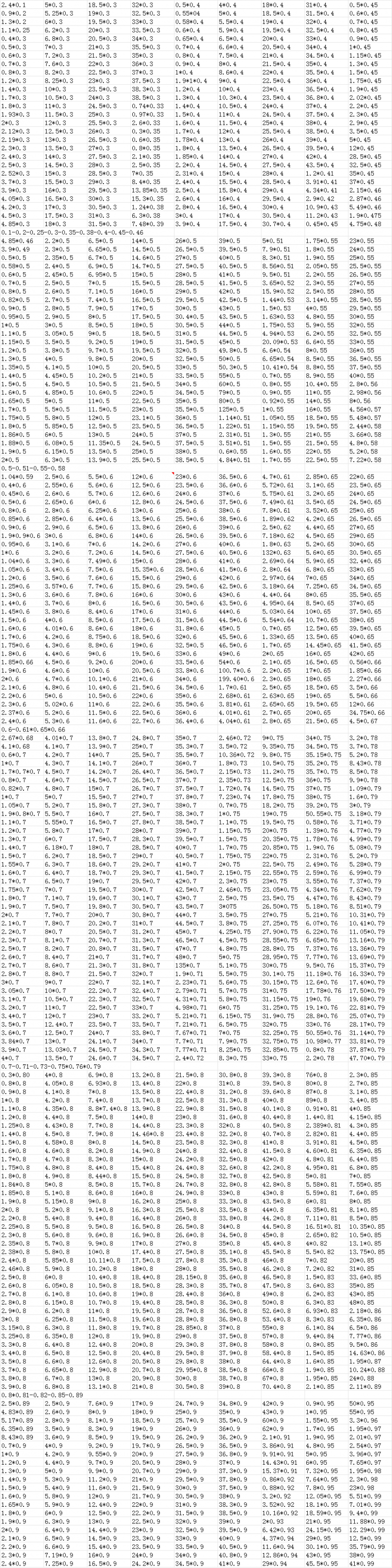 1.3*0.4 | 14.5*0.5 | 3.5*0.6 | 25*0.65 | 45*0.7 | 4.8*0.8 | 52.6*0.8 | 39*0.9 |