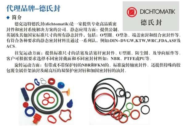 大连创佳氟塑胶密封有限公司作为德克迈特德氏封(Dichtomatik)代理商,是辽宁省**代理。德克迈特德氏封(Dichtomatik)它是一家提供专业高品质密封和密封系统解决方案的公司。对于静态应用方面:所有静态密封件均有公制,英制和其他国际标准尺寸,包括:O形圈,O形杆,端盖密封件和组合密封件等。有静密封材料满足各种要求,并通过一系列认可,如:DIN-DVGW,KTW,WRC,FDA,NSF和ACS。
