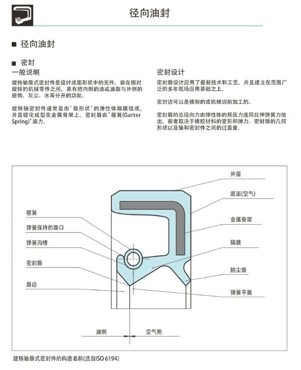 将设计旋转轴唇形密封件成圈状的组件,安装在相对旋转的机械部件之间,能够分离在内部的油或润滑脂,还有外部有灰尘,水等。