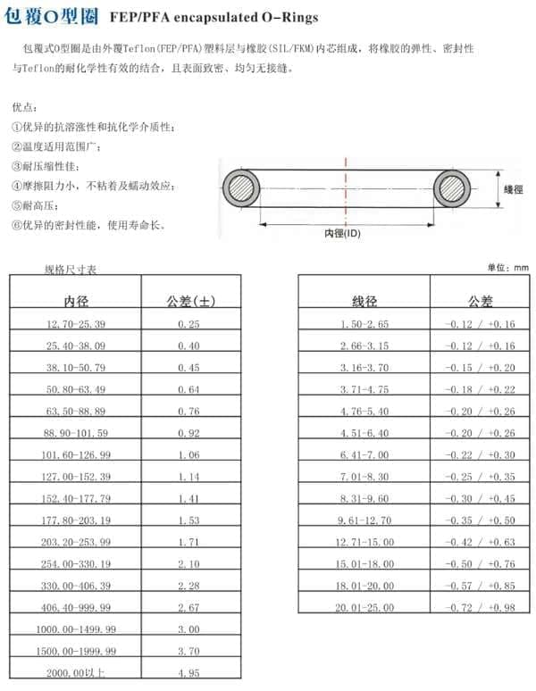 由外覆Teflon(FEP/PFA)塑料层与橡胶(SIL/FKM)内芯组成的包覆式O型圈,将橡胶的弹性、密封性与Teflon的耐化学性有效的结合,且表面致密、均匀无接缝。