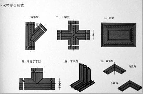 橡胶止水带的接头形式分为六种:一、斜角型;二、平面十字型;三、环型;四、平面丁字型;五、立体丁字型;六、直角型。