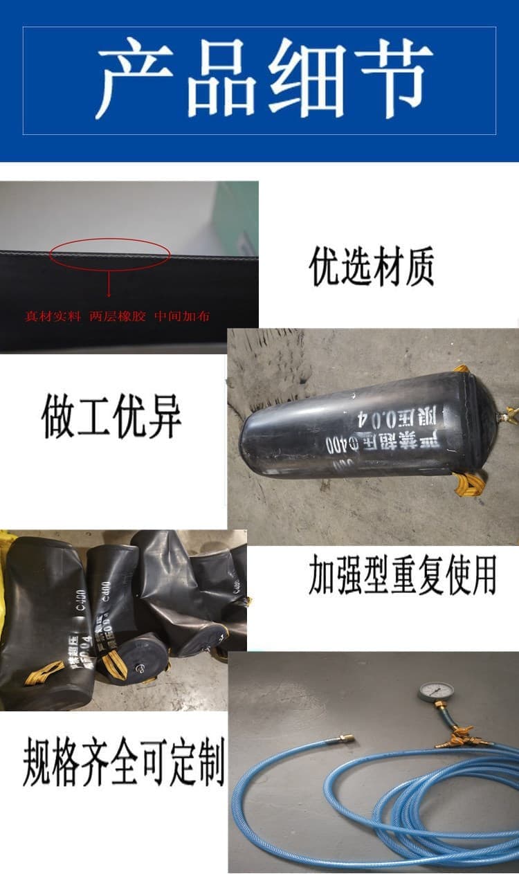 管道封堵气囊的材质及规格 管道封堵气囊主要材质是天然橡胶,制成的产品具有弹性好,使用方便,安全可靠等特点. 封堵气囊的有对应使用于各种常见管道的型号,比如直径200mm排水管道,也有常见市政管道用型号,DN50mm-2500mm范围内的封堵气囊均可生产定做,客户购买时请根据您管道的尺寸,水压,上下游的水位落差,井的高度等使用情况来电咨询,我公司可根据您的具体情况定做封堵气囊.管道封堵气囊的适用范围 管道封堵气囊适用于各种管道封堵测漏,质量检验;排水排污管道检测维修临时堵水,市政管道检修维护,排污除淤等.