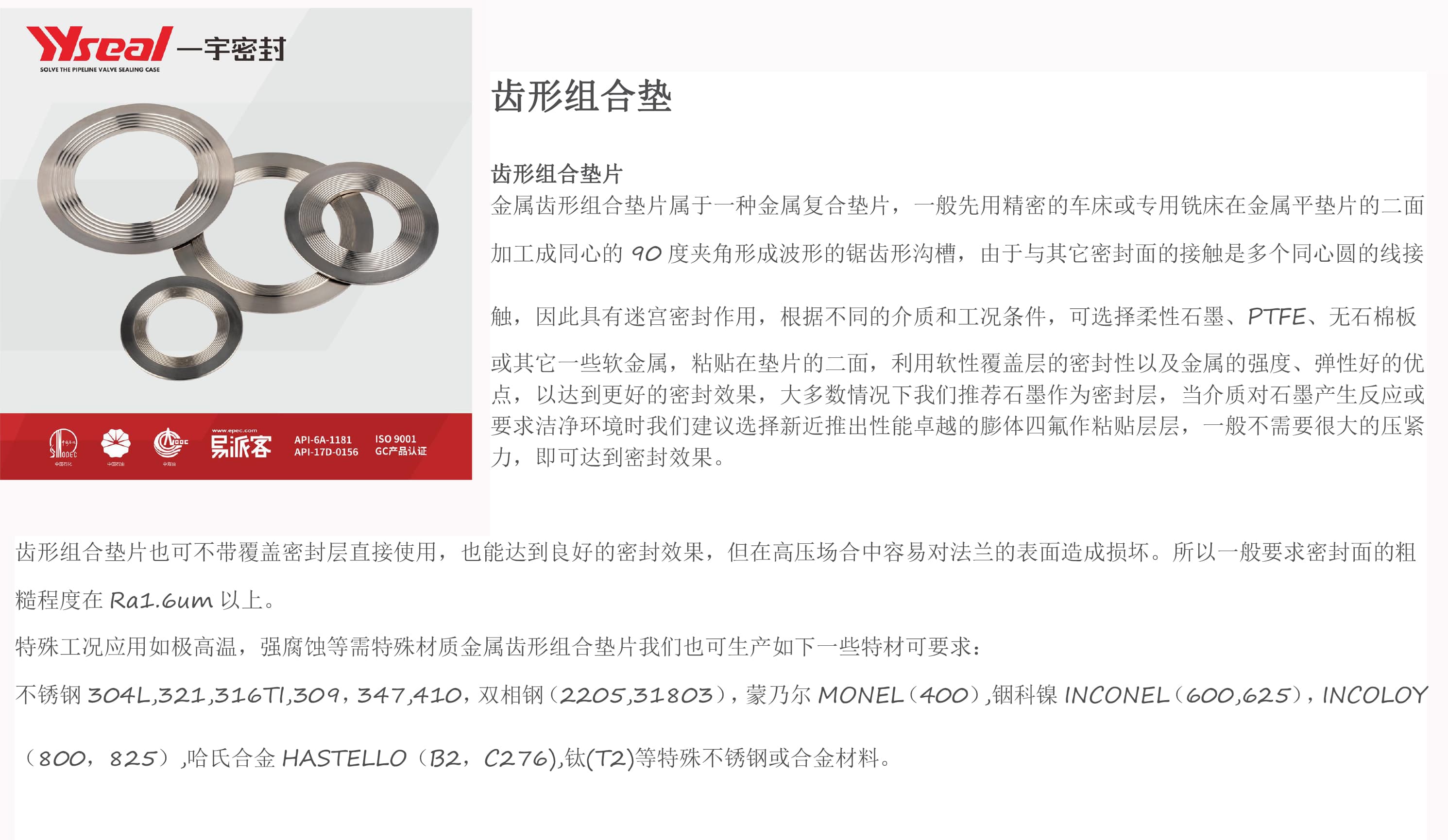 公司目前(生产加工,商业服务)主营产品:密封件、垫片、金属缠绕垫、高强石墨复合垫片、金属环垫、齿型垫、八角垫、椭圆垫、增强包边垫片、聚四氟乙烯垫片、四氟夹层石棉垫片、橡胶衬四氟、盘根、柔性石墨盘根、芳纶纤维维盘根、聚封件、柔性石墨填料环 石棉石墨填料、机械密封件、平焊法兰等,产品*大能生产ф15-ф3000。