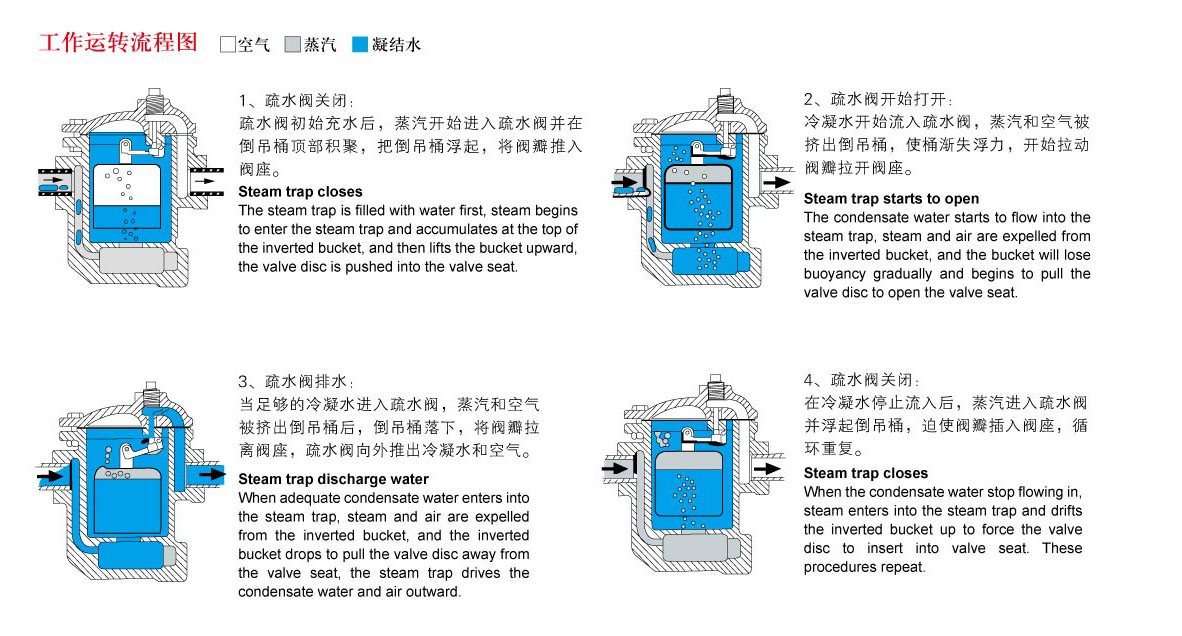 The interior of the inverted bucket steam trap:this valve adopts the operating principles of density difference between condensate water and steam,and the leverage system connects with inverted bucket to form its internal structure,thus controlling the open and close of the steam pressure.The interior of the inverted bucket steam trap is an inverted bucket,a liquid level sensitive part,with the bucket's opening downward.When the device just started,air and low temperature condensate water occur in the pipes,at the moment the steam trap opens thoroughly,the air and low-temperature condensate water are discharged rapidly and the temperature of the device rises immediately.When any steam enters into the inverted bucket,the bucket will obtain buoyancy and the fixed lever of the bucket drives the valve core to close the valve.There is small aperture on the inverted bucket,which can discharge air automatically.As some of steam is discharged from such aperture,while other steam produces condensate water.The inverted bucket loses the buoyancy and sinks down and its fixed lever drives the valve core to open the valve.When the steam re-enters into the bucket,the valve will close again.It repeats the said procedures to discharge water intermittently.